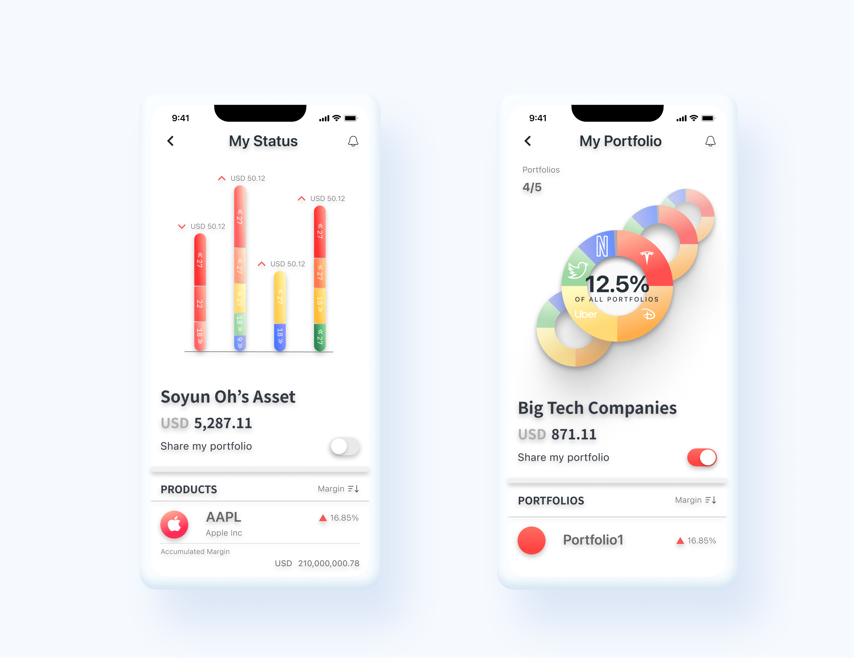 Investment apps deliver quite rich information to the user. However, this heaviness risks overwhelming the users. I tried increasing the enjoyable user experience while crucial information is reachable. The swiping motion of dating apps was introduced to discover portfolios. Users can move around the wheel to quickly browse their portfolio status. This reduces user fatigue compared to traditional investment UX.