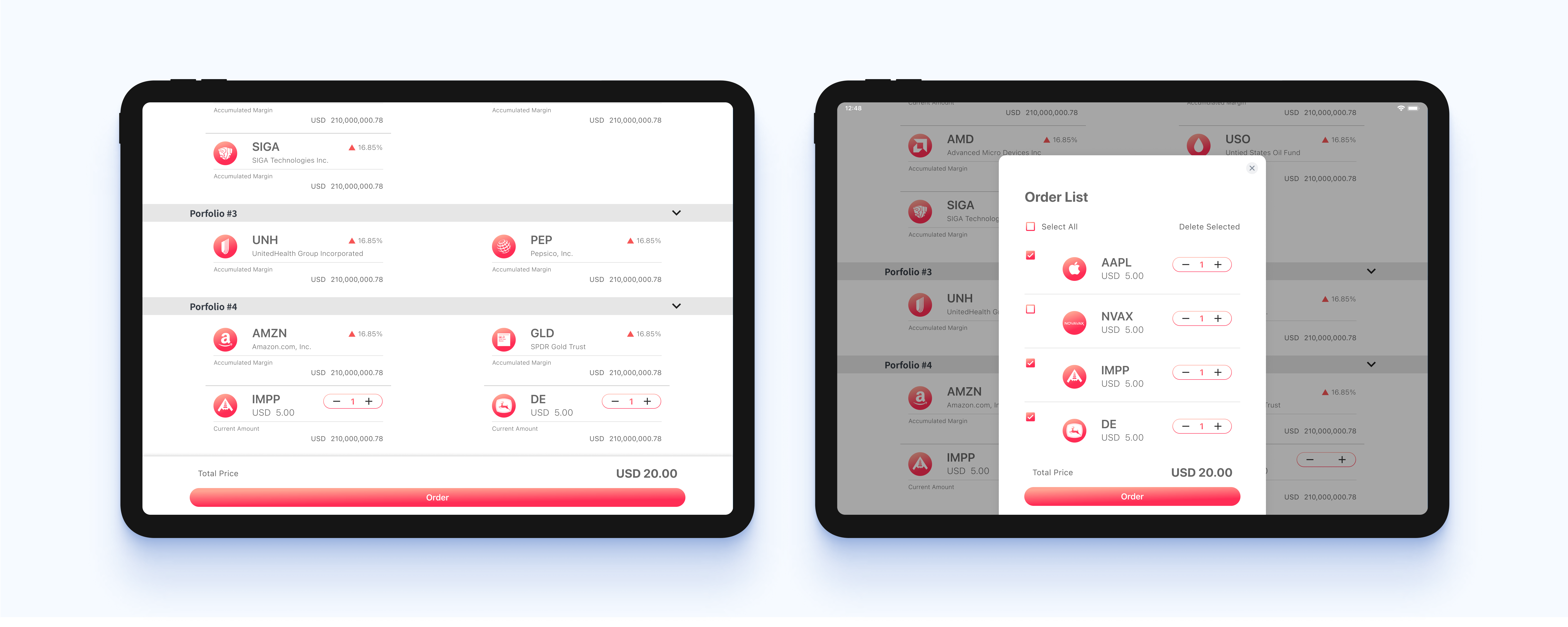 I was asked to realize the app focusing on the major function, which was buying and selling the shared stock, within two pages. This required very neat, concise, but powerful architecture that contains multiple functions in a tight space available.